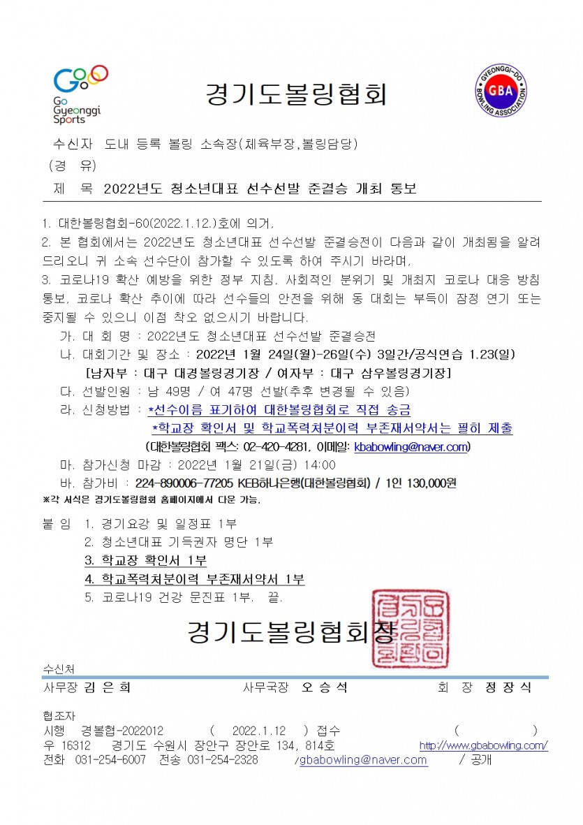 2022년도 청소년대표 선수선발 준결승 개최 통지